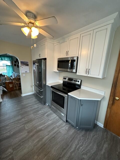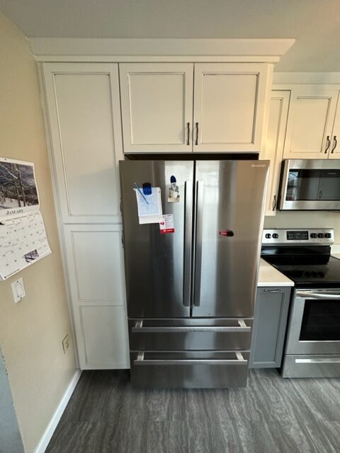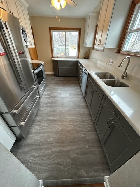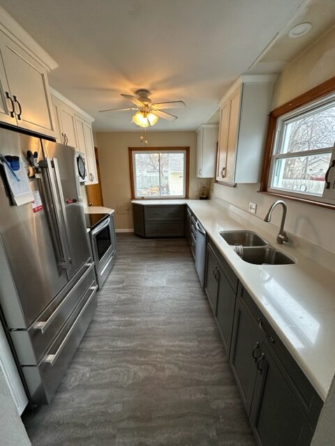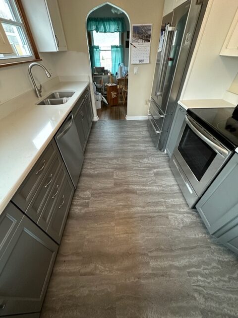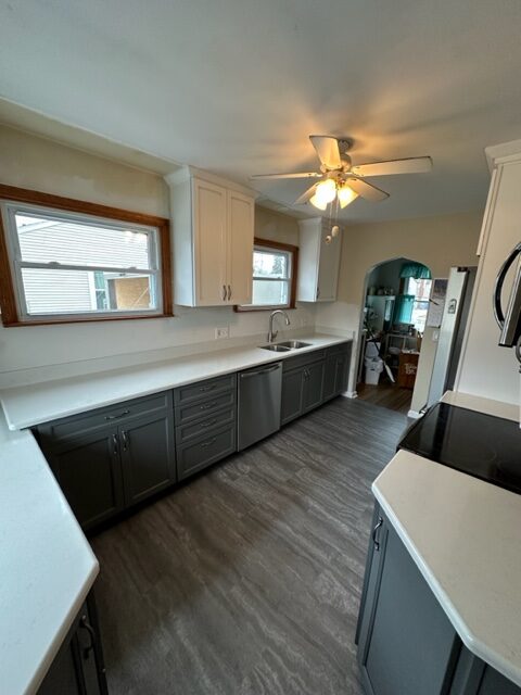 Talk about a transformation! We installed contrasting upper and lower cabinets, new quartz counter tops and vinyl plank flooring. The new layout provided an easy to maneuver kitchen space that checked all of the boxes. We love projects like these, and would be thrilled to help you out with your home renovation. Give us a call to get the ball rolling today!