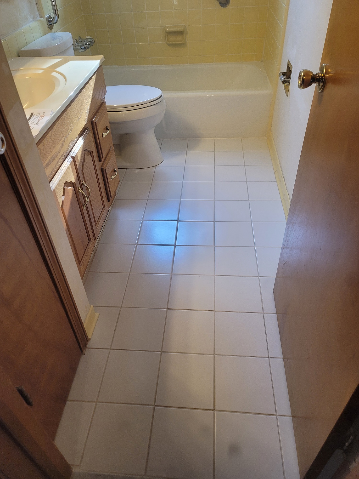 Welcome back to another project completed by A+ Home Improvements! Once this client contacted us, we especially looked forward to helping out because we already had a great experience renovating their kitchen several years ago. This time around, we needed to totally transform the bathroom! The existing bathroom was dated and original to the home. Thick tile covered the walls, and the fixtures were starting to show there age. To help us, our client already knew the look they were going for. With a design concept already in mind, we went to work helping with the product selection process. Our client desired one thing – they wanted to keep the original cast tub. When considering your project, remember that this is possible, but the result is not always ideal. Luckily, we saved this client’s tub without incurring any damage. Let’s take a look at the old space.