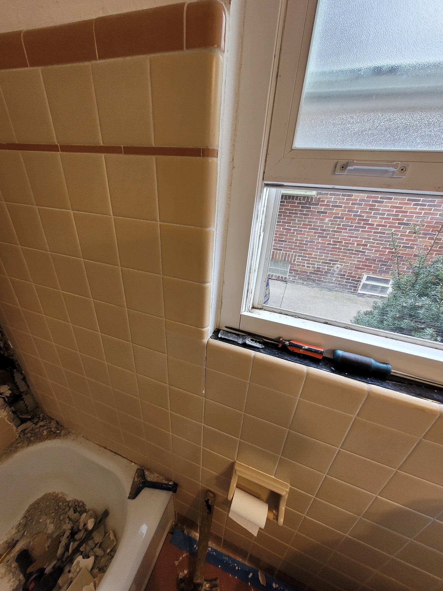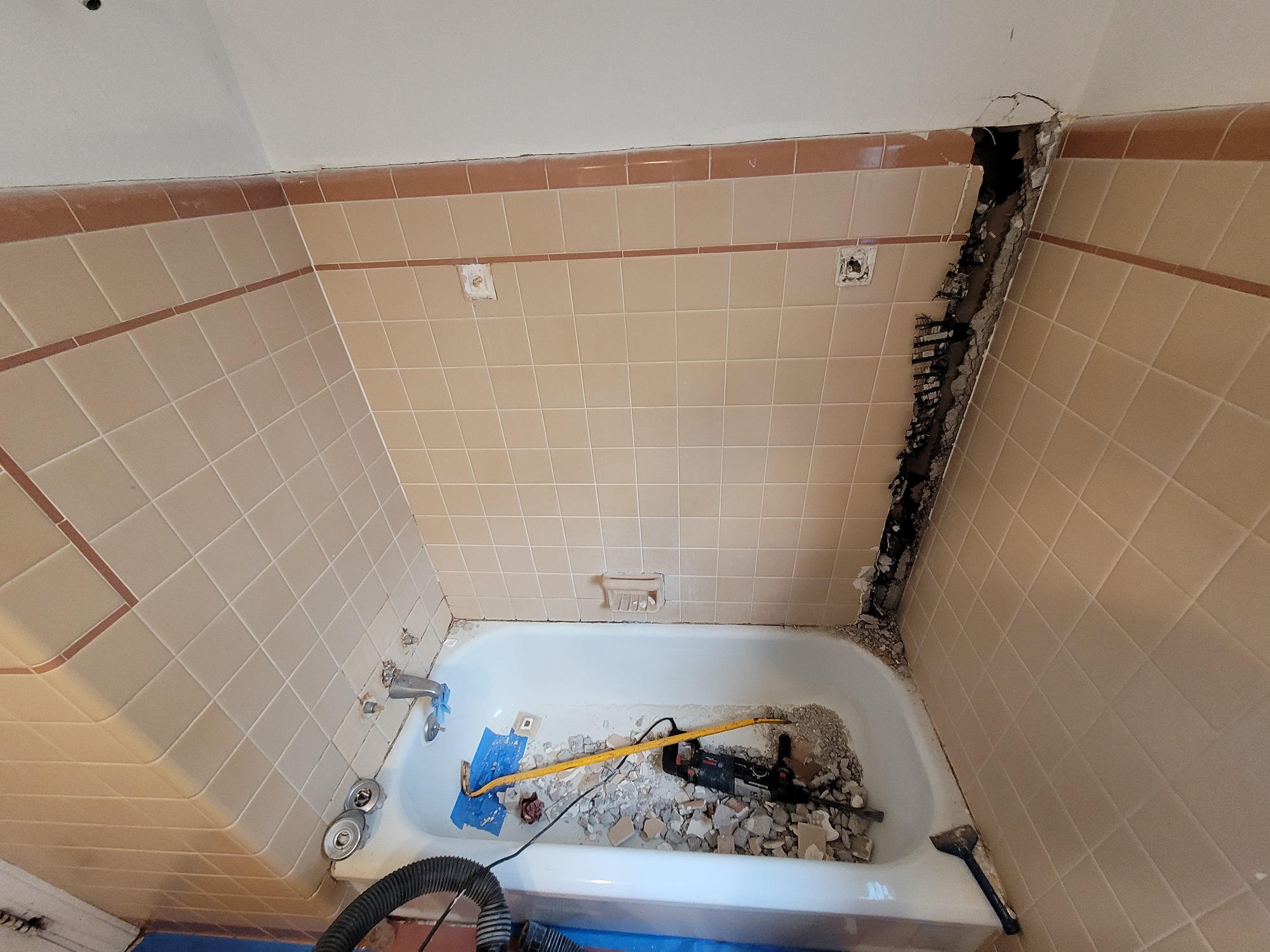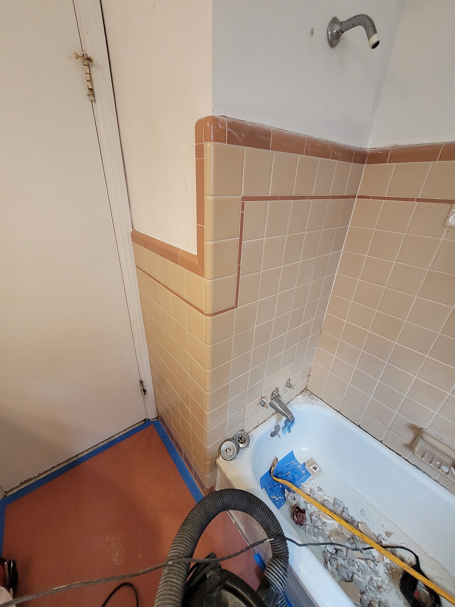 Not all bathroom projects are huge. Many clients desire to simply replace their bath tub enclosure or fixtures in an effort to provide a small facelift. This client’s bathroom provided the obstacle of replacing a tub surrounded with thick set tile. Many bathrooms in our demographic have tile similar to this. When these situations arise, we strive to find the right solutions for our clients. Sometimes budgets just don’t allow for the whole project, which is fine. We replace tub enclosures similar to this situation all the time. The goal is to complete the installation in a fashion that allows for further renovation down the line without affecting the new tub installation. Once out client selected the products they wanted installed, we went to work on the tub installation.