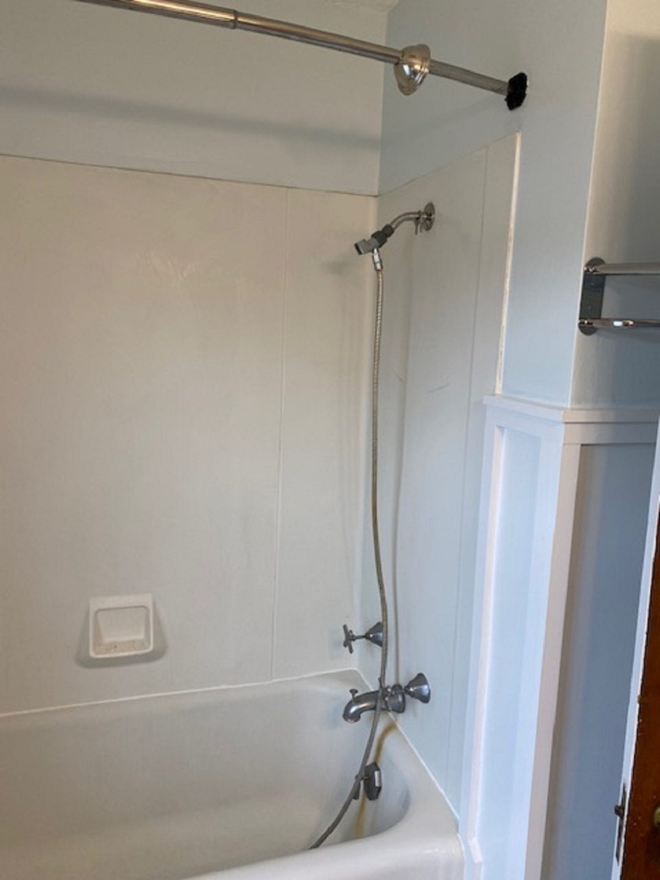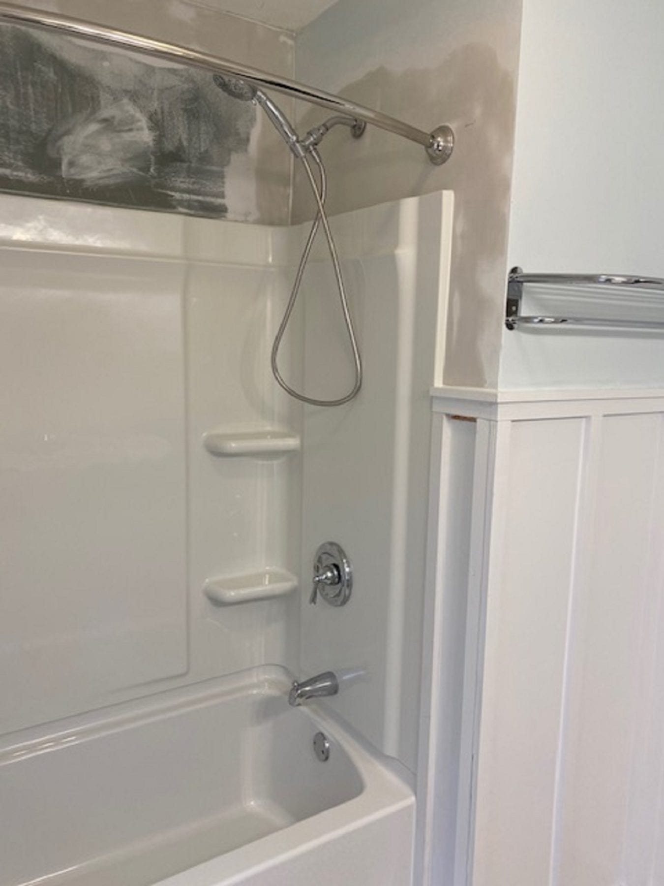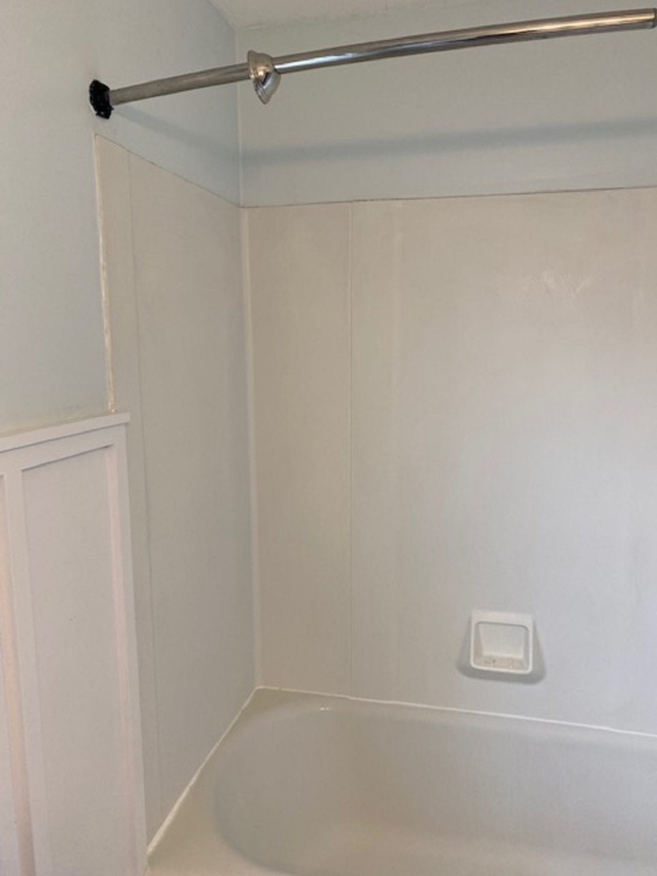 The new tub surface allows for much easier cleaning. Also, due to the stud mount design of the new unit, not more silicone is needed! The wainscot was modified and reinstalled, and our client loved the results.