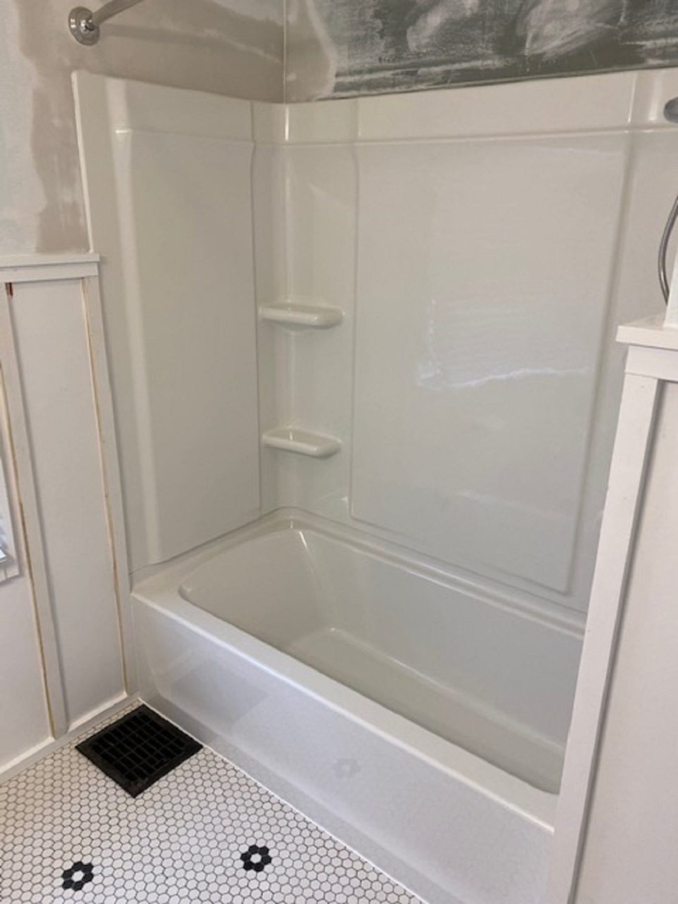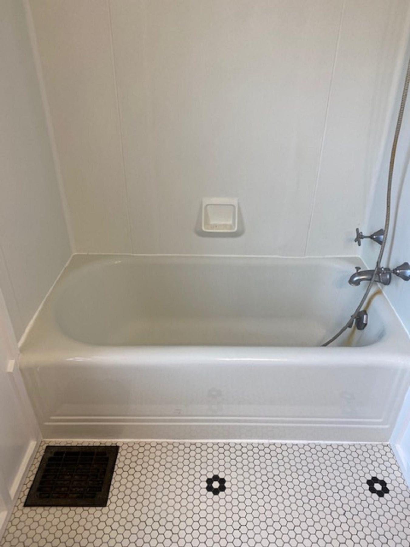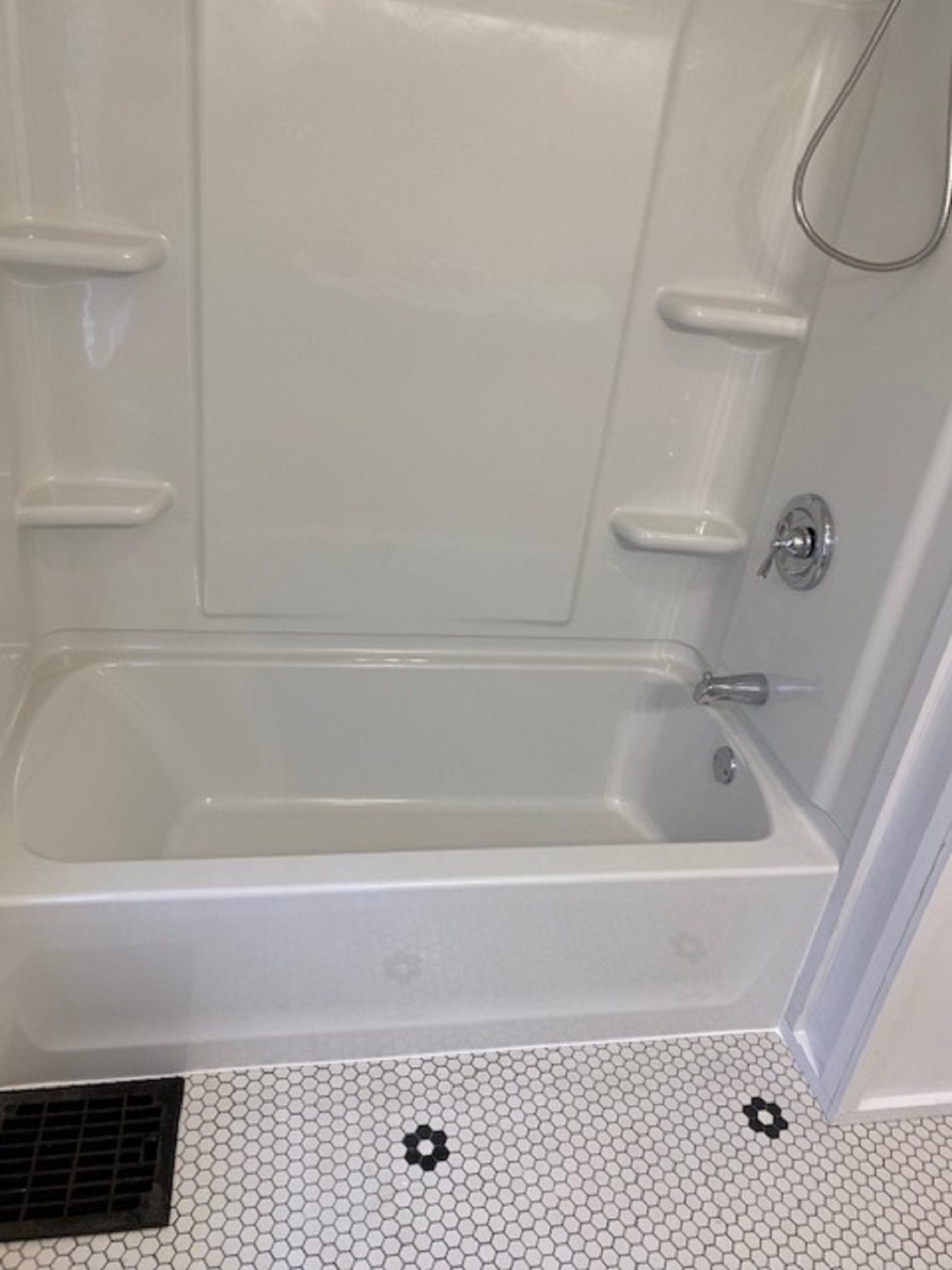 The new tub surface allows for much easier cleaning. Also, due to the stud mount design of the new unit, not more silicone is needed! The wainscot was modified and reinstalled, and our client loved the results.