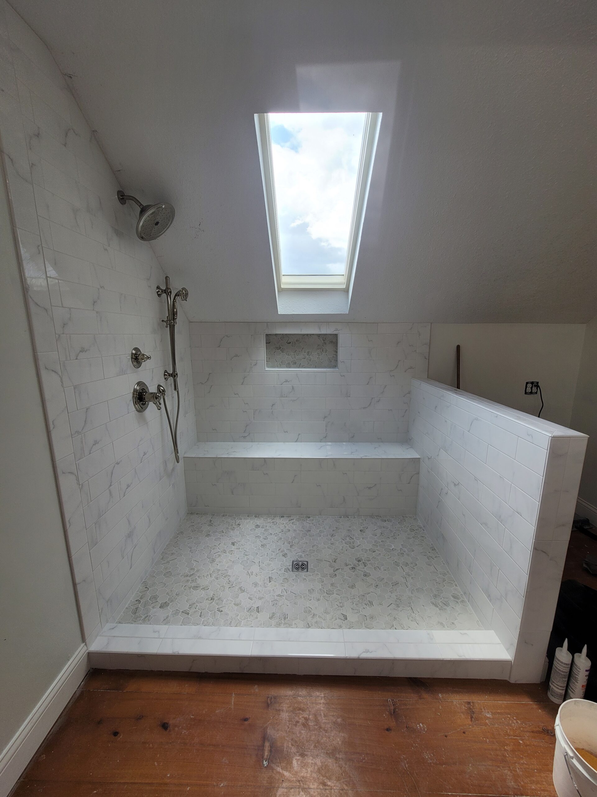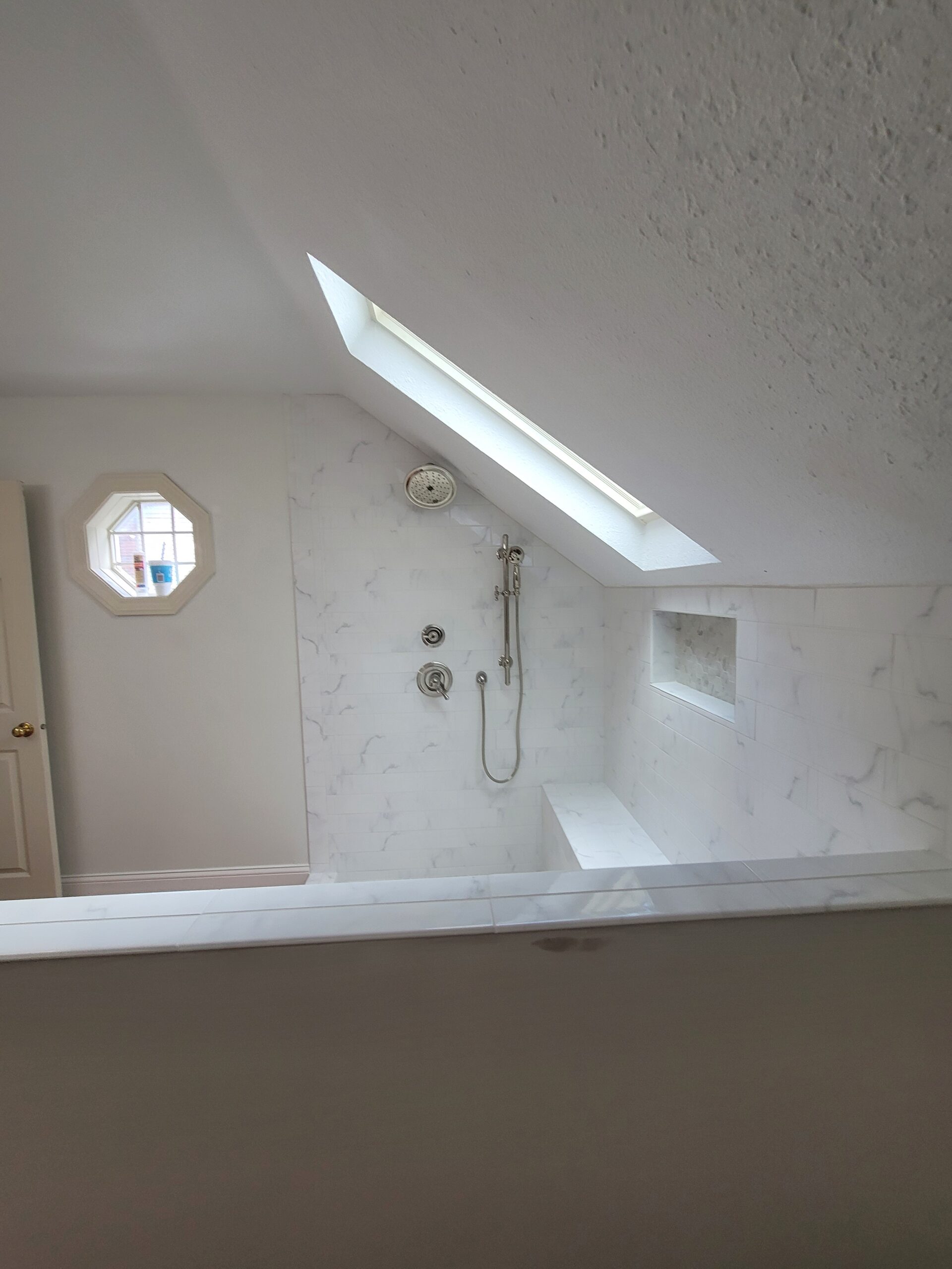 We know what you are thinking: with the vaulted ceiling, how are we supposed to change the tub to a custom tiled shower? For starters, we briefed out client on the options available to us. Saving the original wood floors was imperative to our client, so we decided to use the existing tub space. To allow more room with the ceiling height, we reframed the half wall to allow for a deeper shower. We also framed a shower bench along the exterior wall to utilize a space that would otherwise be too short for anything else. The shower fixtures chosen by our client worked perfectly for the new design, and the tile selection was a home run!