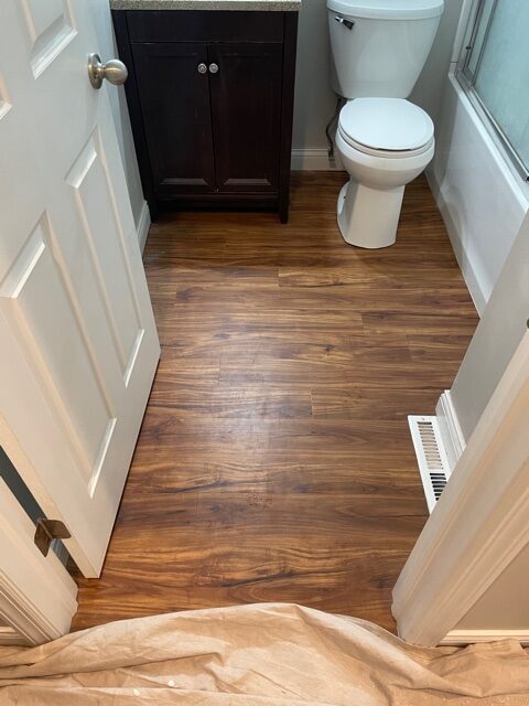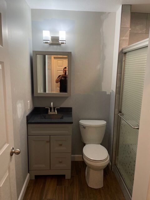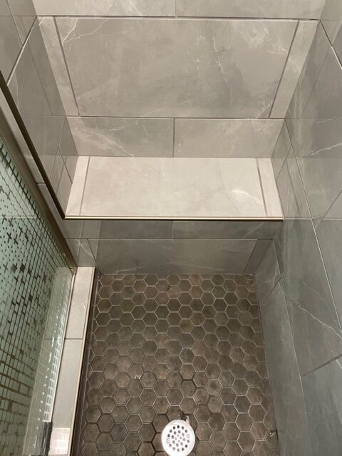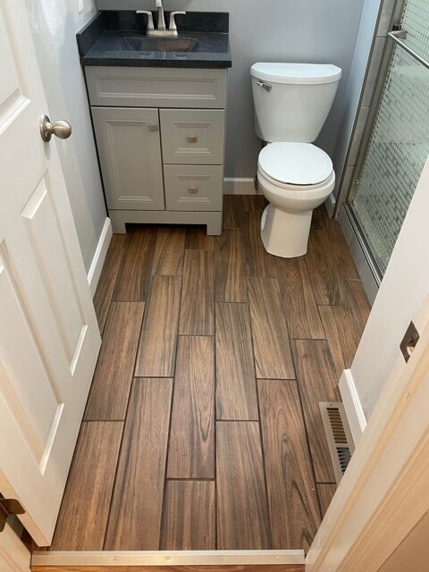 As we mentioned earlier, there was absolutely nothing wrong with the existing space. Inaccessibility was the only downfall with the current layout. We removed the tub and installed a tile shower enclosure with bench seating. The vinyl flooring was removed and wood-look tile flooring was installed in its place. We updated the vanity and other fixtures in the bathroom as well. Here is the finished result: