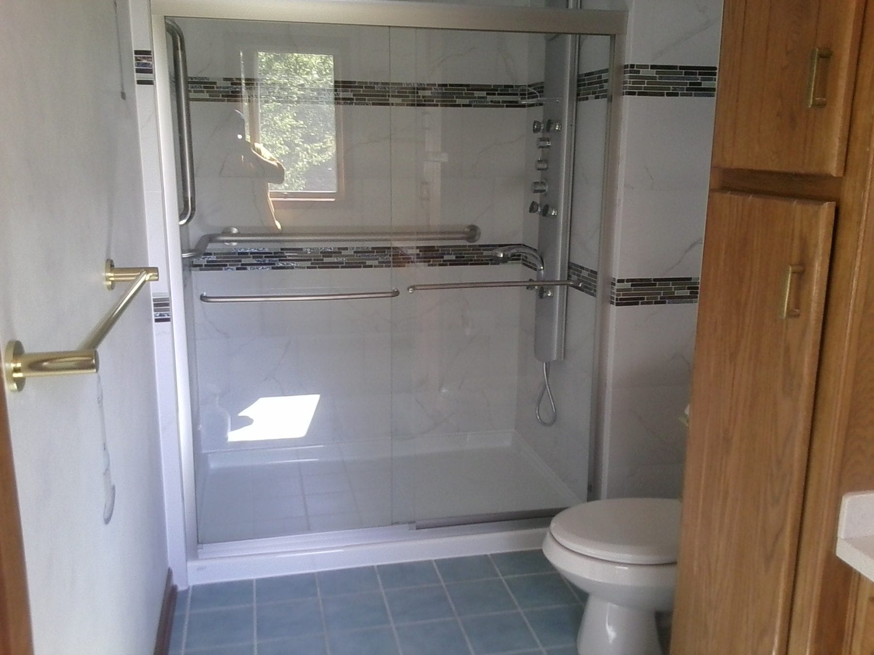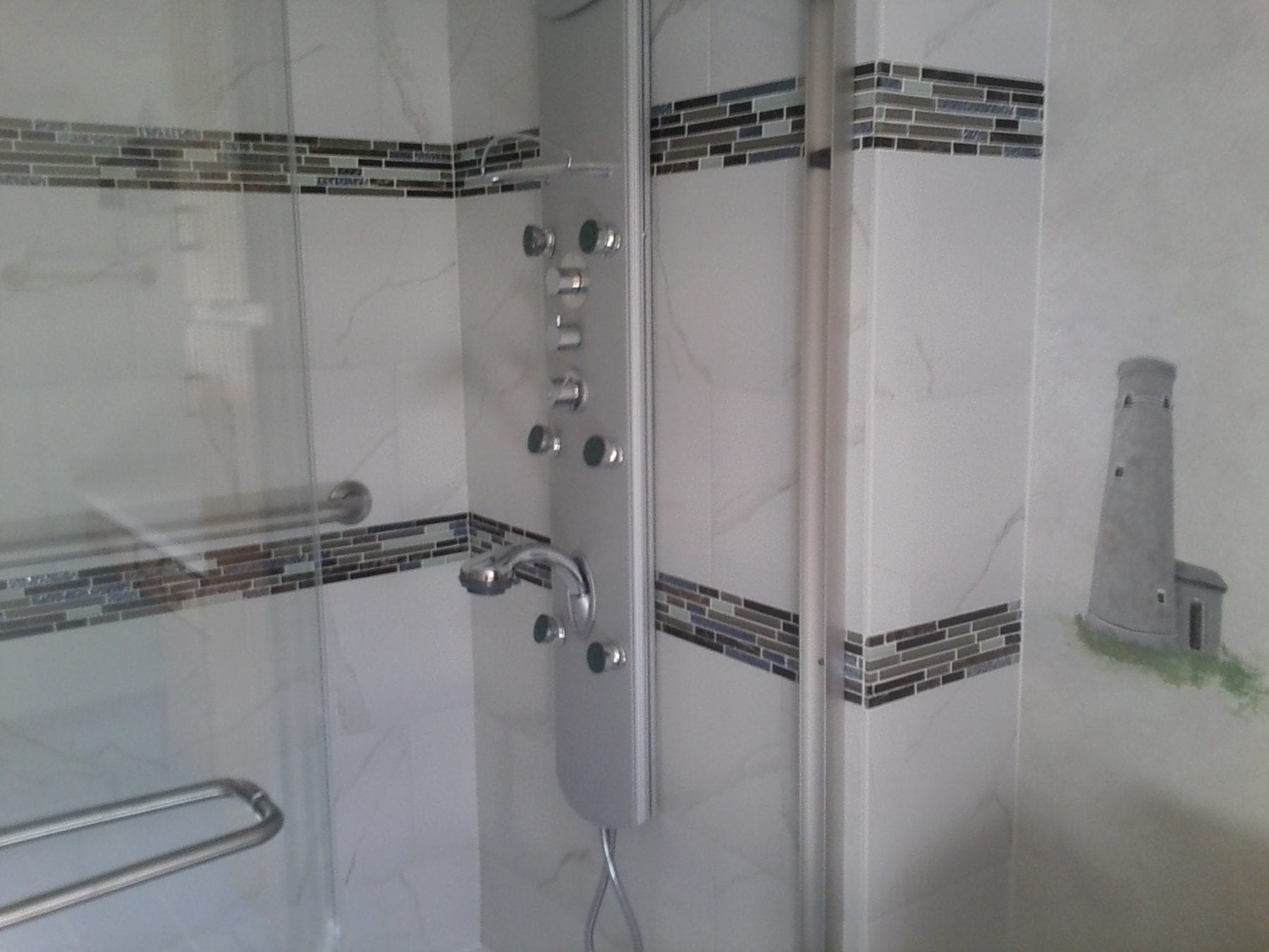 A tub to shower transformation changes the look of a bathroom. Some changes, however, are more dramatic. Not many of these built in tub enclosures are still out there, but what an eyesore! Not only was the tub enclosure removed, but the soffit overhead was deleted to make more room. This client wanted to add accents to this shower, so the rows of mosaic tile were incorporated into the surround. Not all tiled enclosures need a tiled pan. While a tiled pan is nice, it definitely adds cost to the project. A clean, streamlined fiberglass shower pan was installed for this project and looks fantastic! The jetted shower faucet tower looks amazing and provides relaxing relief after a long day. Clear shower doors allow the beauty of the tile to be clearly visible. After the project was complete, this looked like a totally different bathroom!
