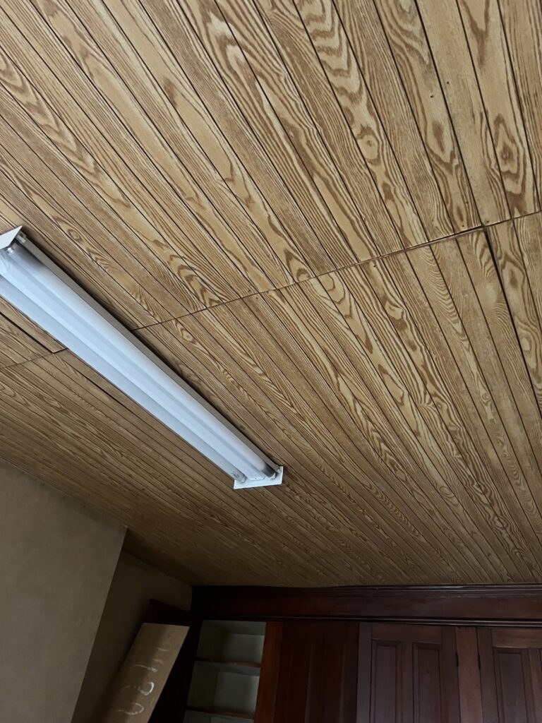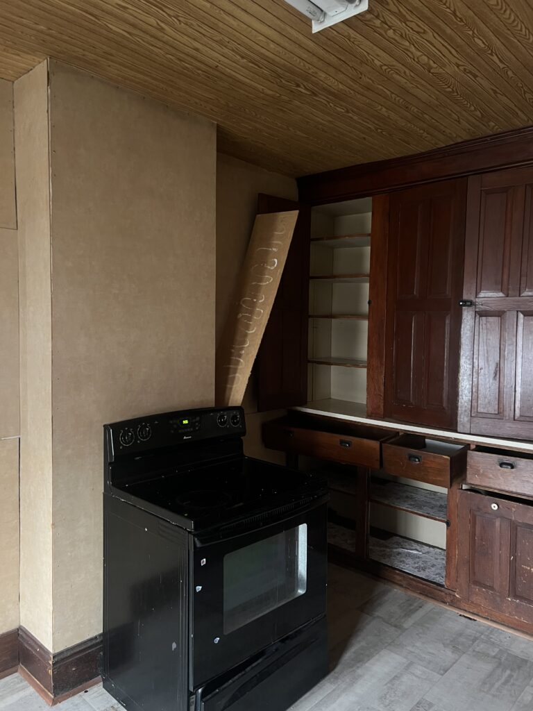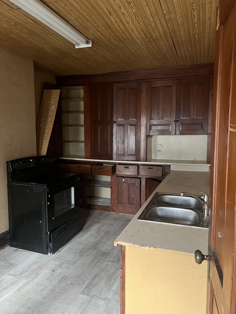 Welcome back, Everybody! Our next client wanted to complete a renovation to update an old kitchen. Older homes often have kitchen spaces that are cramped or contain a weird layout. In this situation, the kitchen offered absolutely nothing that our homeowner wanted. Over the years, previous owners cobbled together the cabinets and flooring, and installed paneling over the ceiling to cover the failing plaster. One obstacle contained in the kitchen was the chimney that ran right in the middle of a cabinet run. We worked with our client to get the perfect design, and then geared up to tackle the project. Take a look at what we started with: