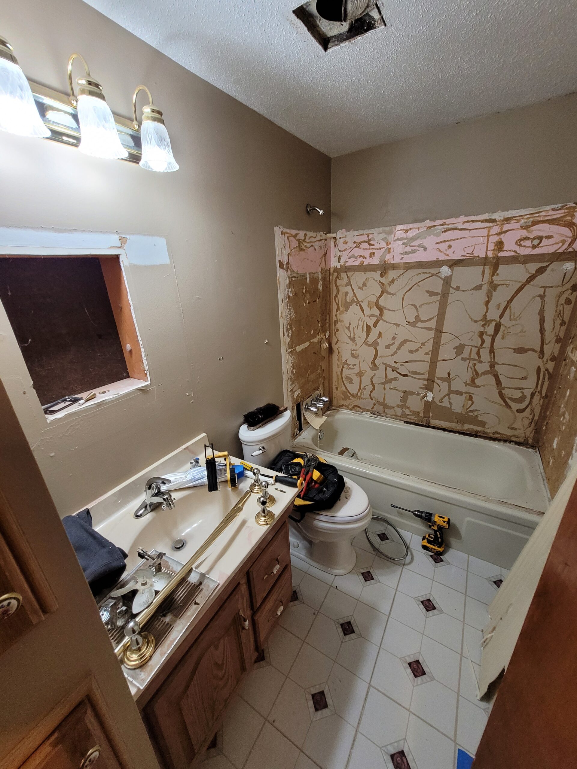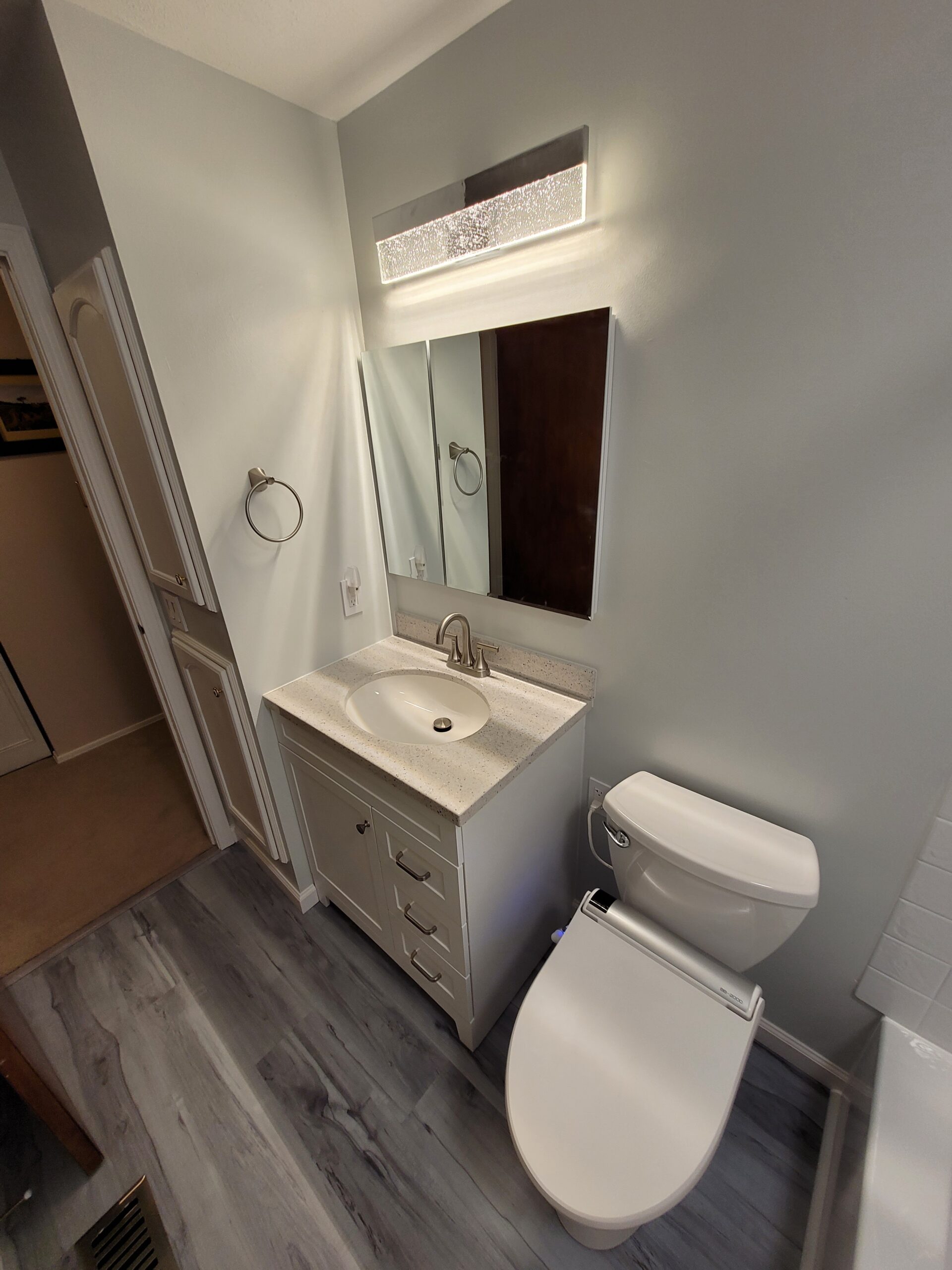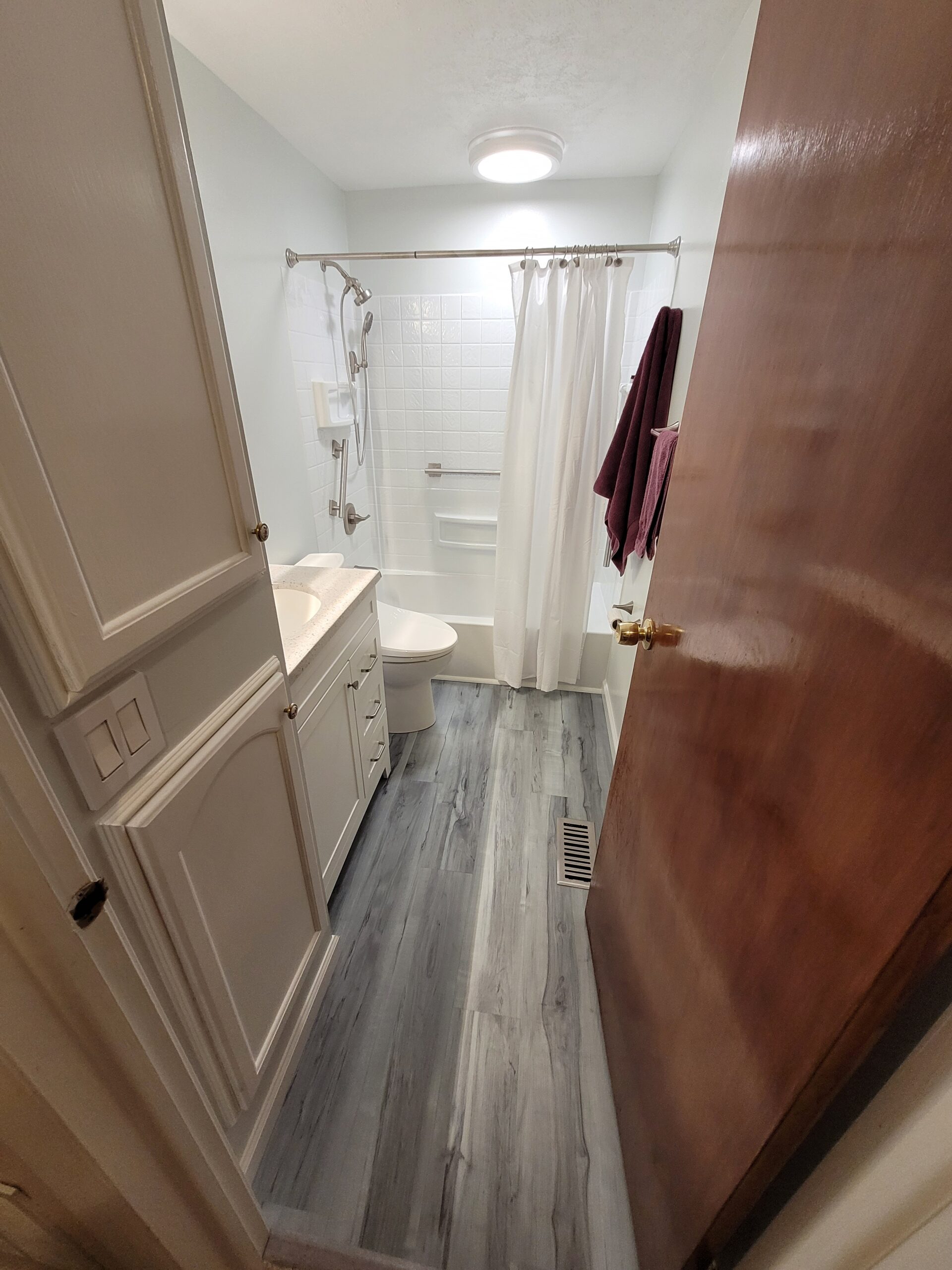 Out with the old, in with the new! We removed the old fixtures and finishes, and prepared for reassembly. The new LVT flooring really helped pull it all together!