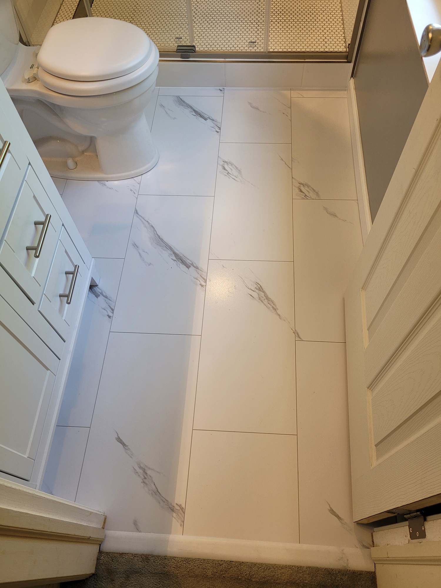 What a difference!! We installed a clean white tile surround to create a beautiful shower enclosure. Our client also wanted the look of tile for the floor, but without the cold and slippery surface. We installed the perfect Luxury Vinyl Plank flooring to match the new master bathroom. Once we finished with the vanity and lighting, we cleaned up and got out of the way. Our client was now free to enjoy their new master bathroom for years to come!