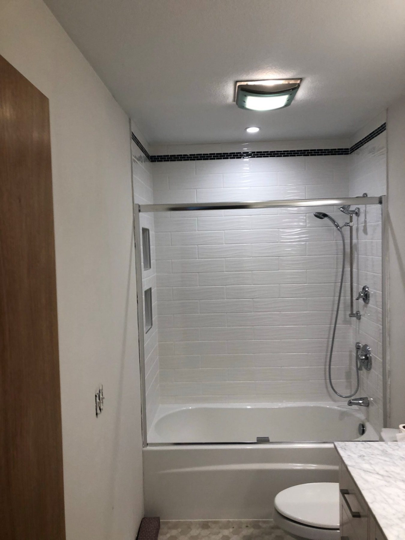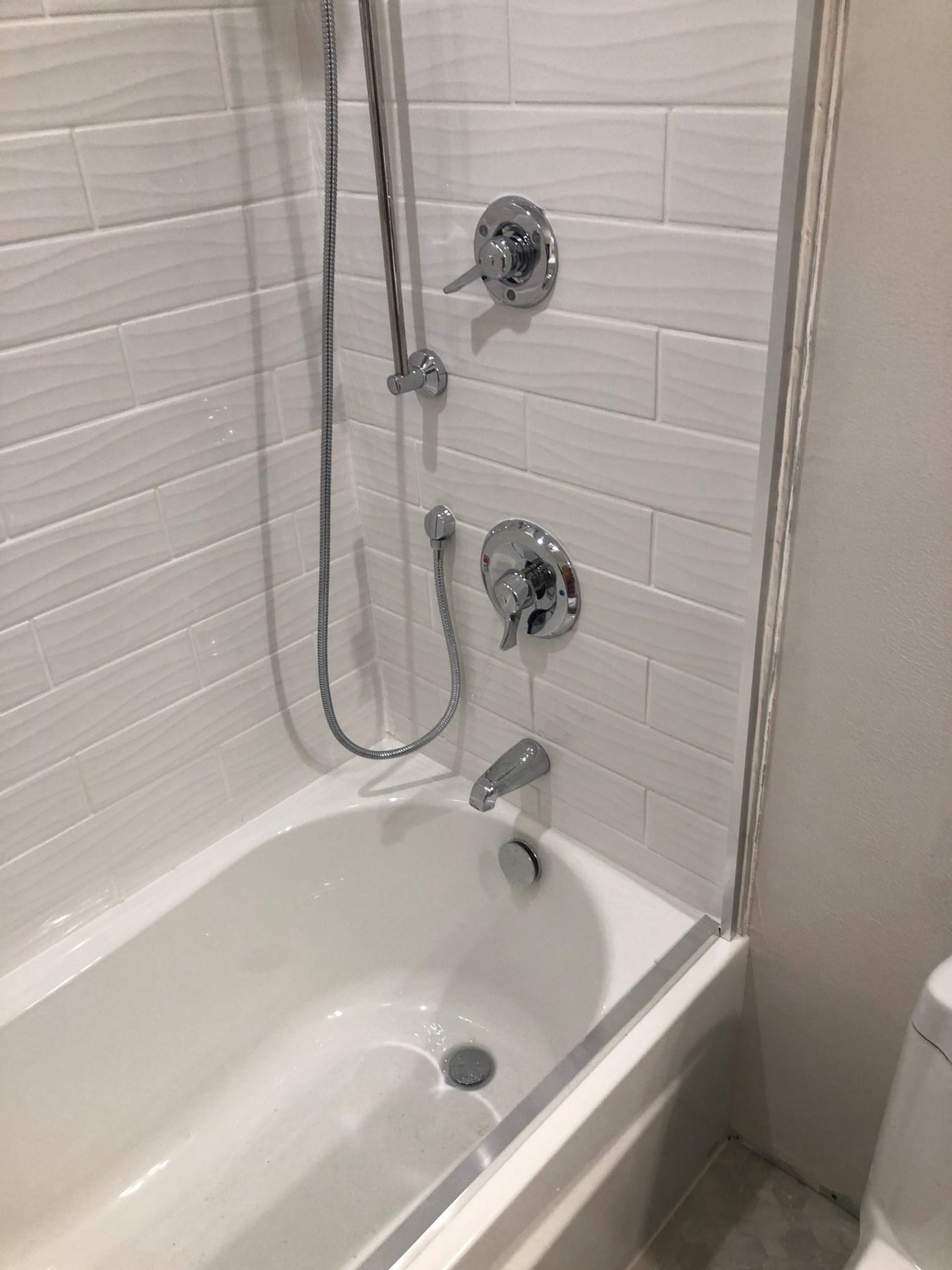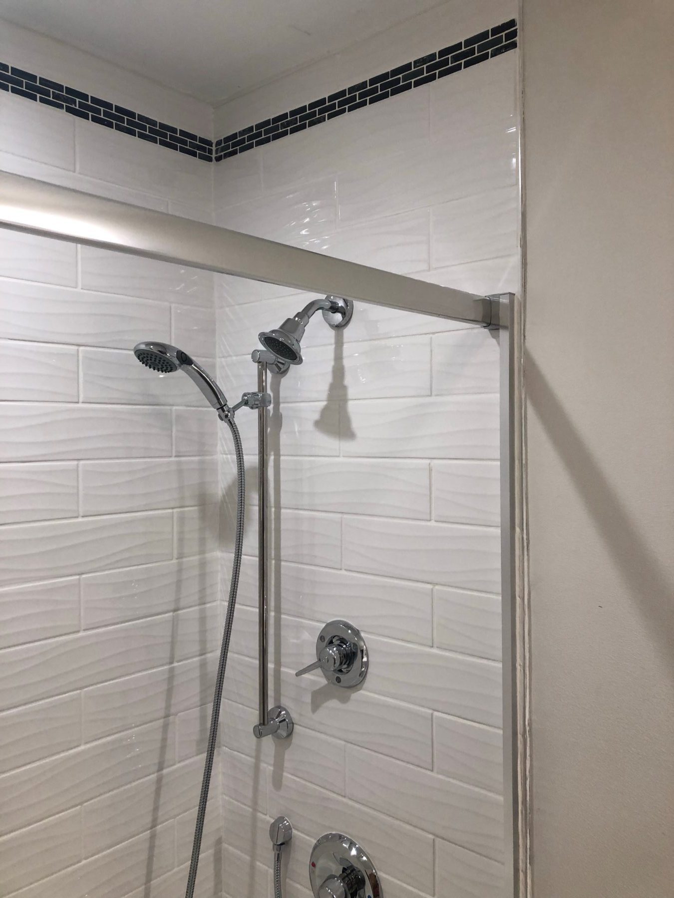 Our client wanted the look of white subway tile, but wanted to add their own touch. The textured tile that our client chose gave some character to the tub enclosure. See the black tile inlay at the top of the surround? This can be accomplished in many different colors and styles, and allows you to pull the other colors in the bathroom together. It also helps break up the solid white tiled shower appearance with your own personal flair. While the tile choice is important, fixtures are an important choice as well.