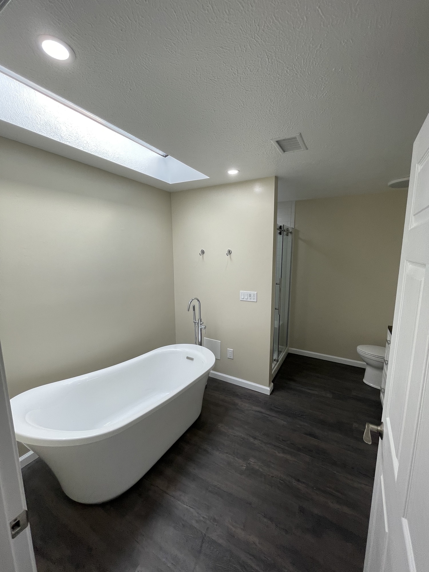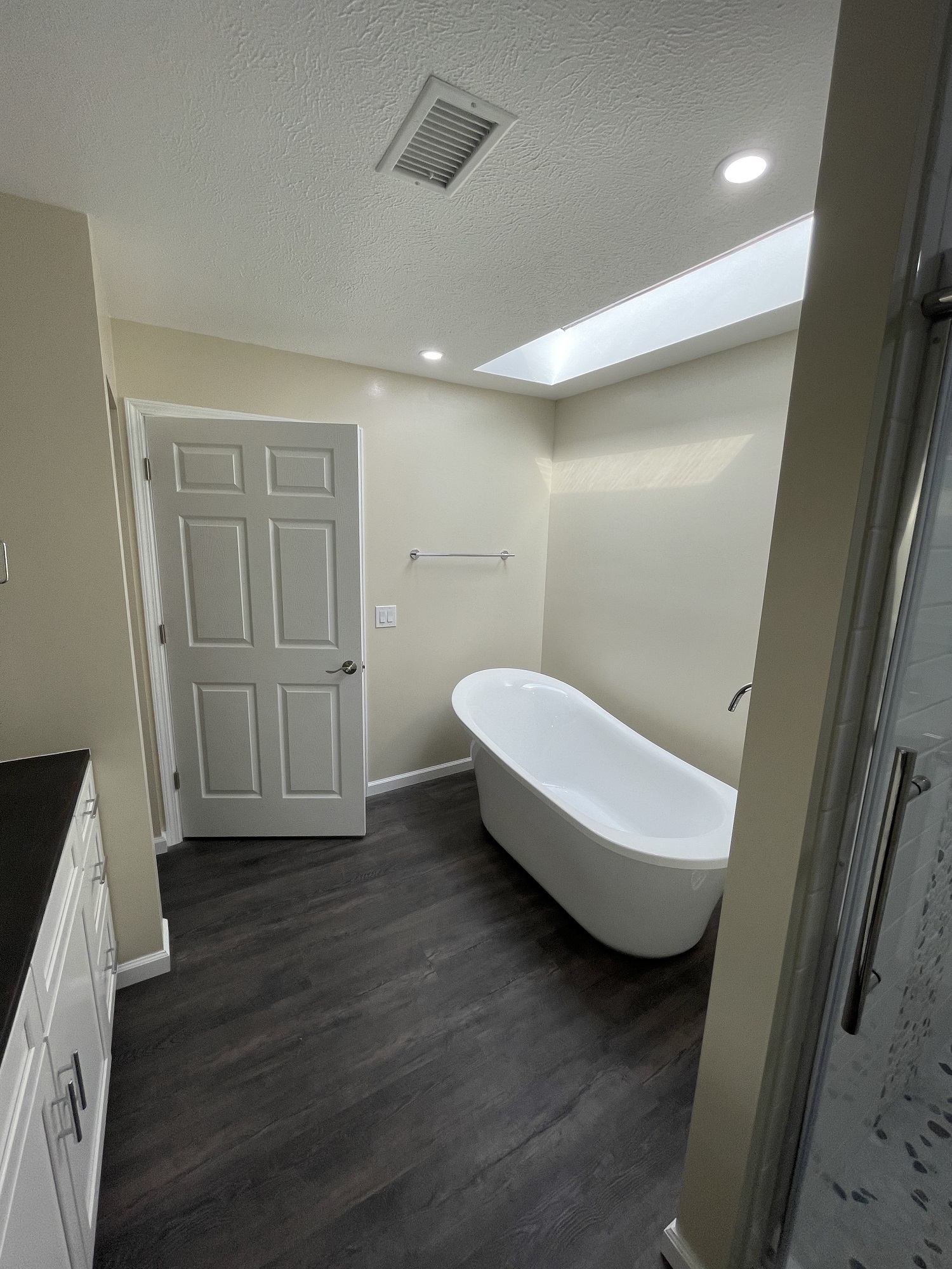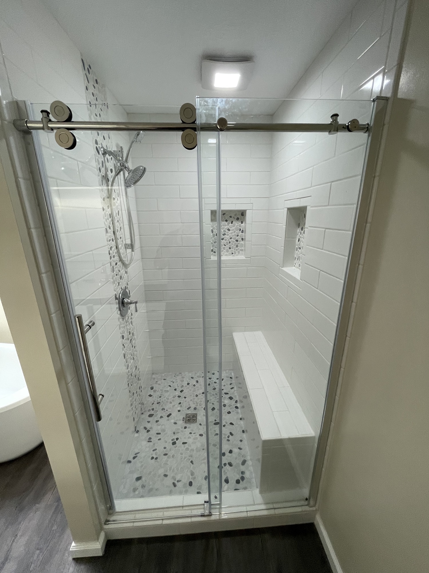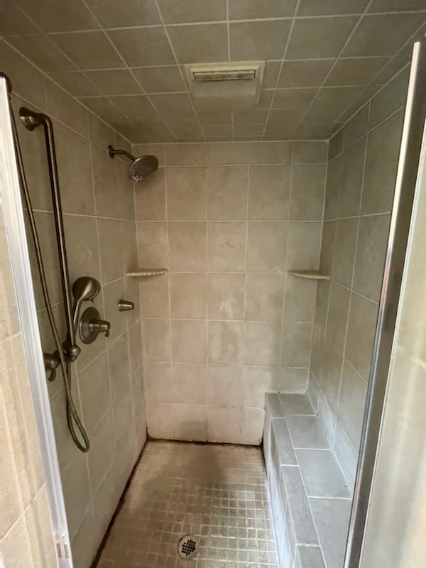 See- plenty of space, but clearly outdated. Our client desired a more open concept. The old roman tub had to go, and the tile shower showed year of wear and tear. We deleted the soffit and pony wall next to the vanity to open up the space, and removed the enormous tub that was just wasting space. The end results looked like an entirely different bathroom!