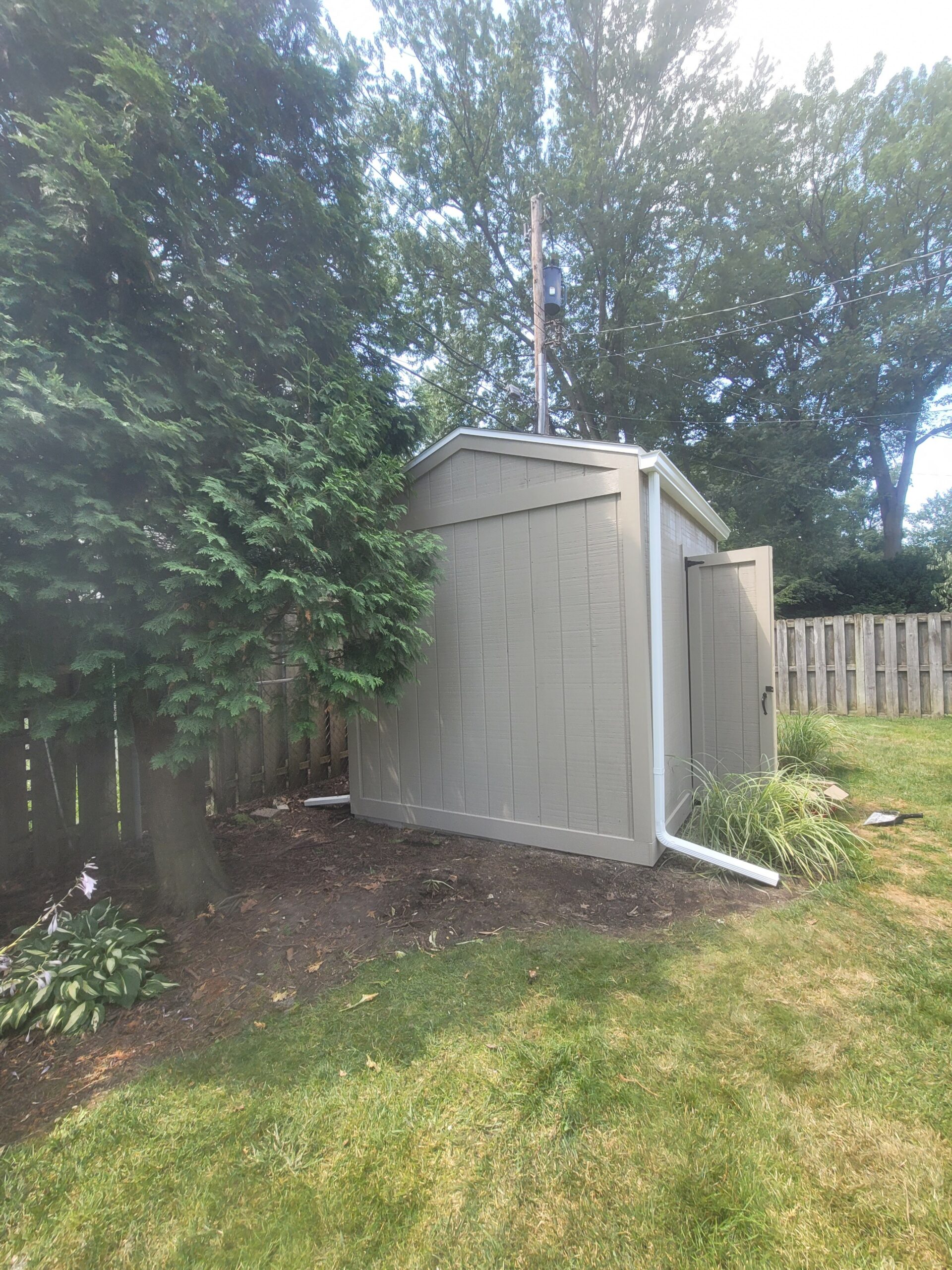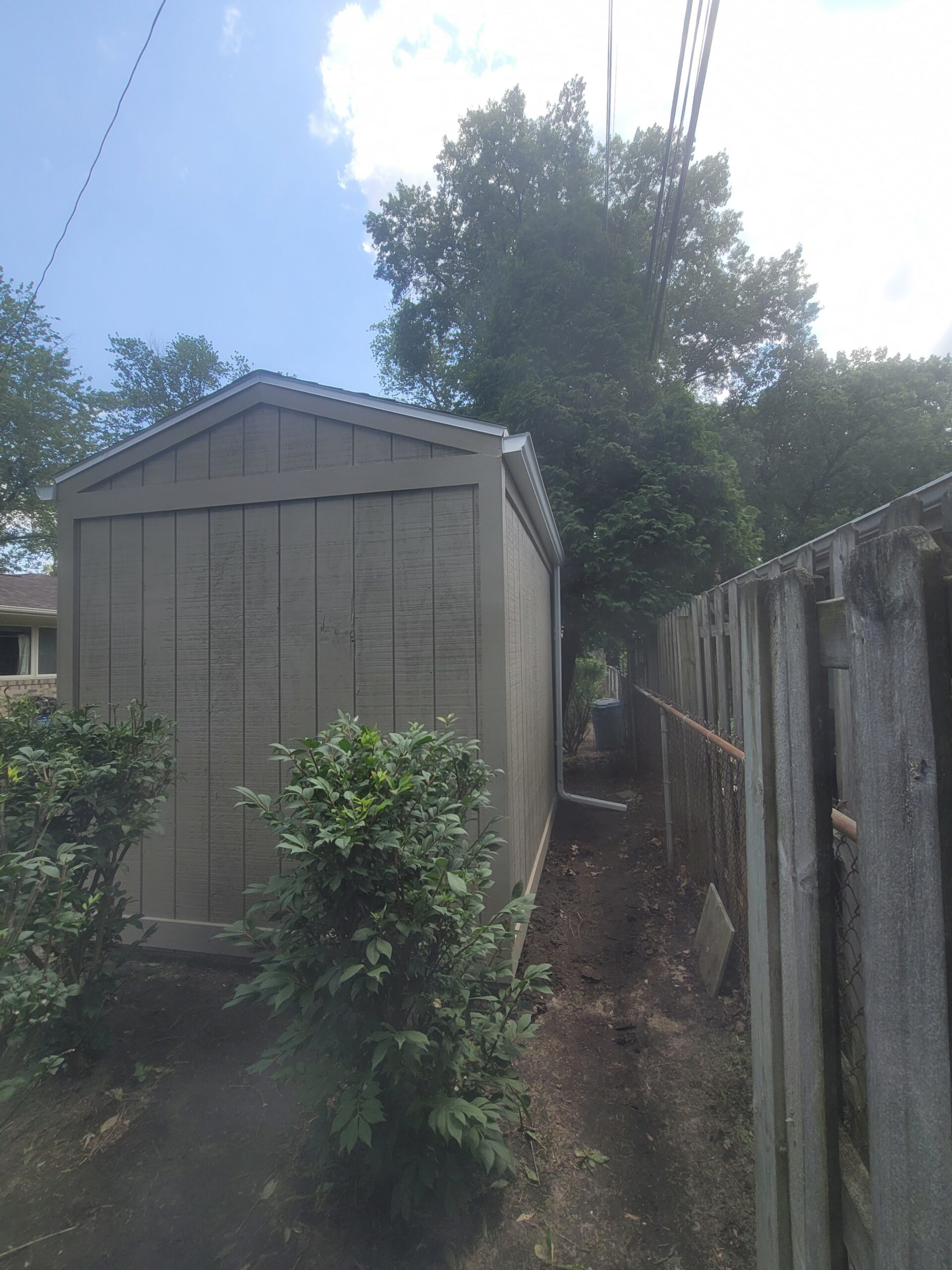 Pretty simple, right? As we already mentioned, this home owner wasn’t looking for anything extravagant. They simply needed something dry and secure to store away their seasonal items. We installed T1-11 siding along with composite 1x trim to help fight future wood decay. We also painted the new wood shed with a single color that matched the home. New gutters help direct water away from the new structure. While simple in nature, this shed was exactly what our client needed.